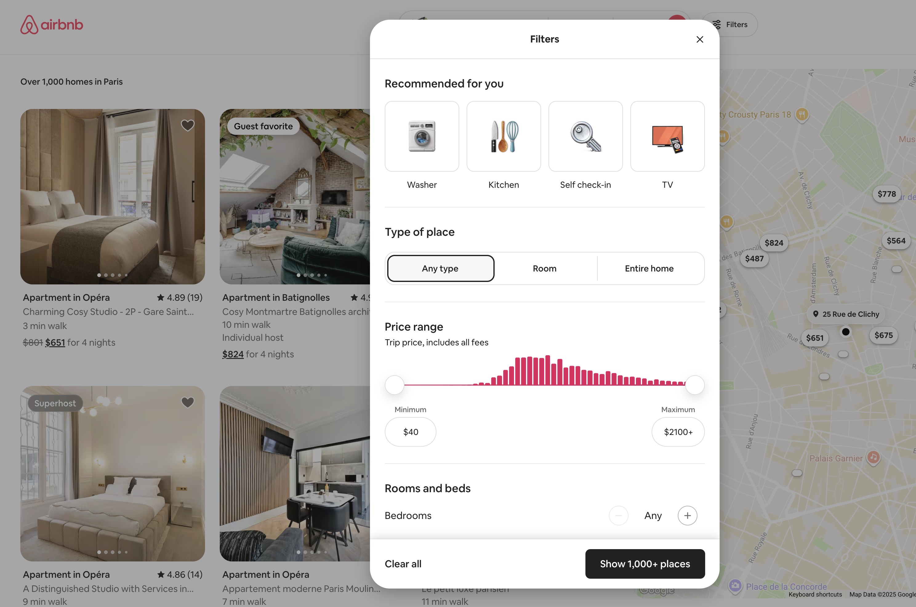 Filtering UIs are another big category of long-tail UIs, and they involve so many tradeoffs and tough design decisions you could literally write a book about just them. Airbnb’s filtering UI here is definitely making an effort to make simple things easy with (personalized! 😍) shortcuts and complex things possible via more granular controls.